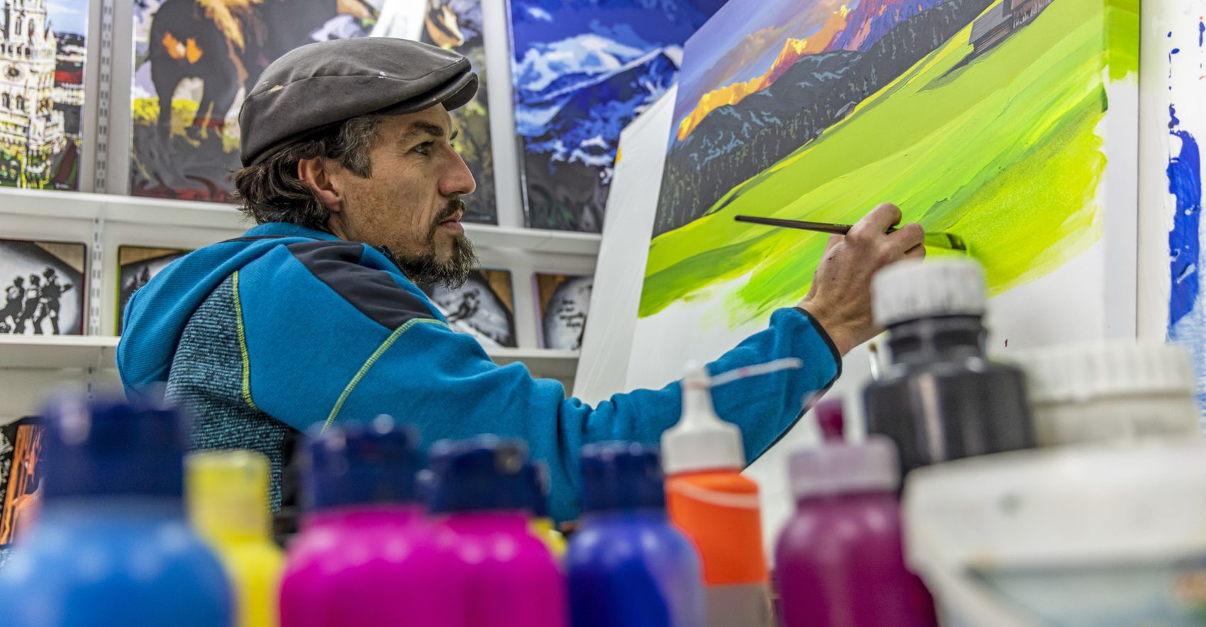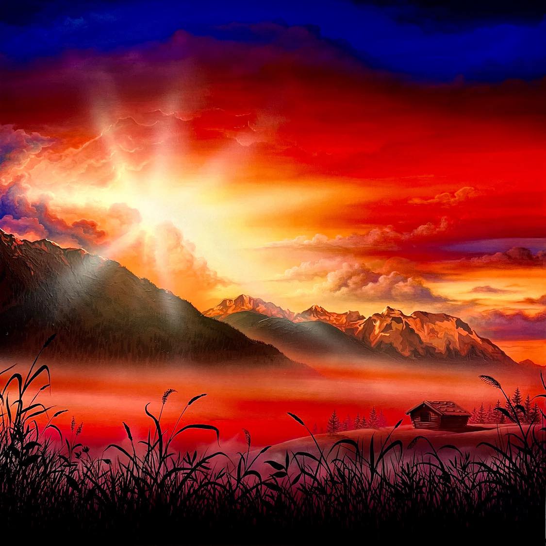 Epische Lichtstimmungen und Naturschauspiele in den Bergen behalte ich nach meinen ausgedehnten Trails in meiner Heimat stets für die Umsetzung in meiner Malerei in Erinnerung und binde diese für gewöhnlich stark überzeichnet in meine Arbeiten mit ein.
