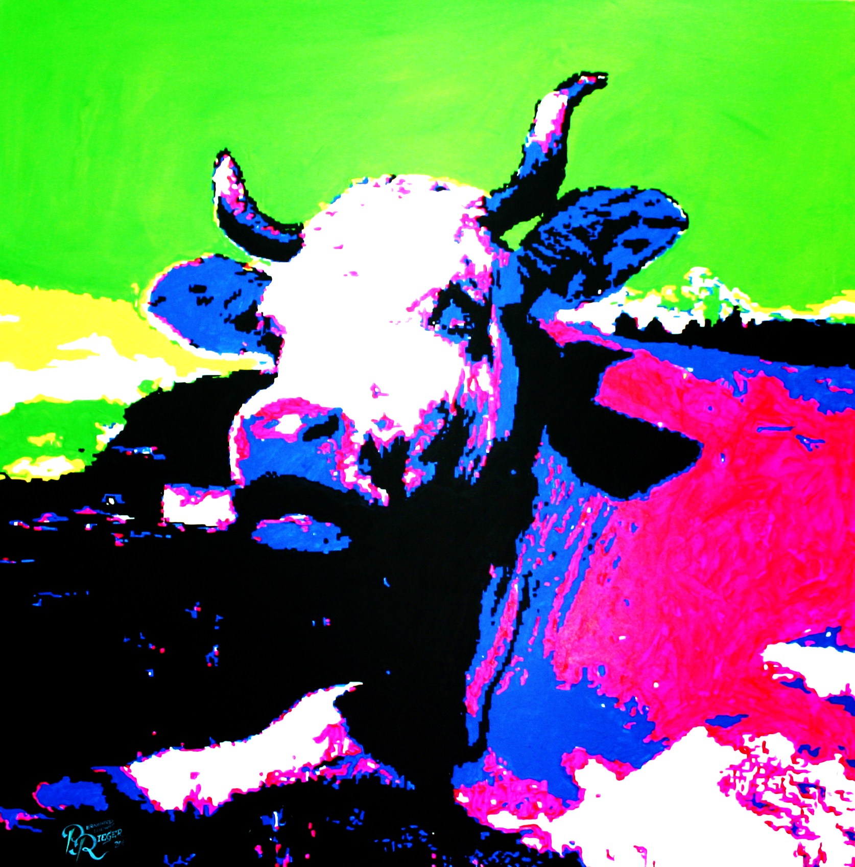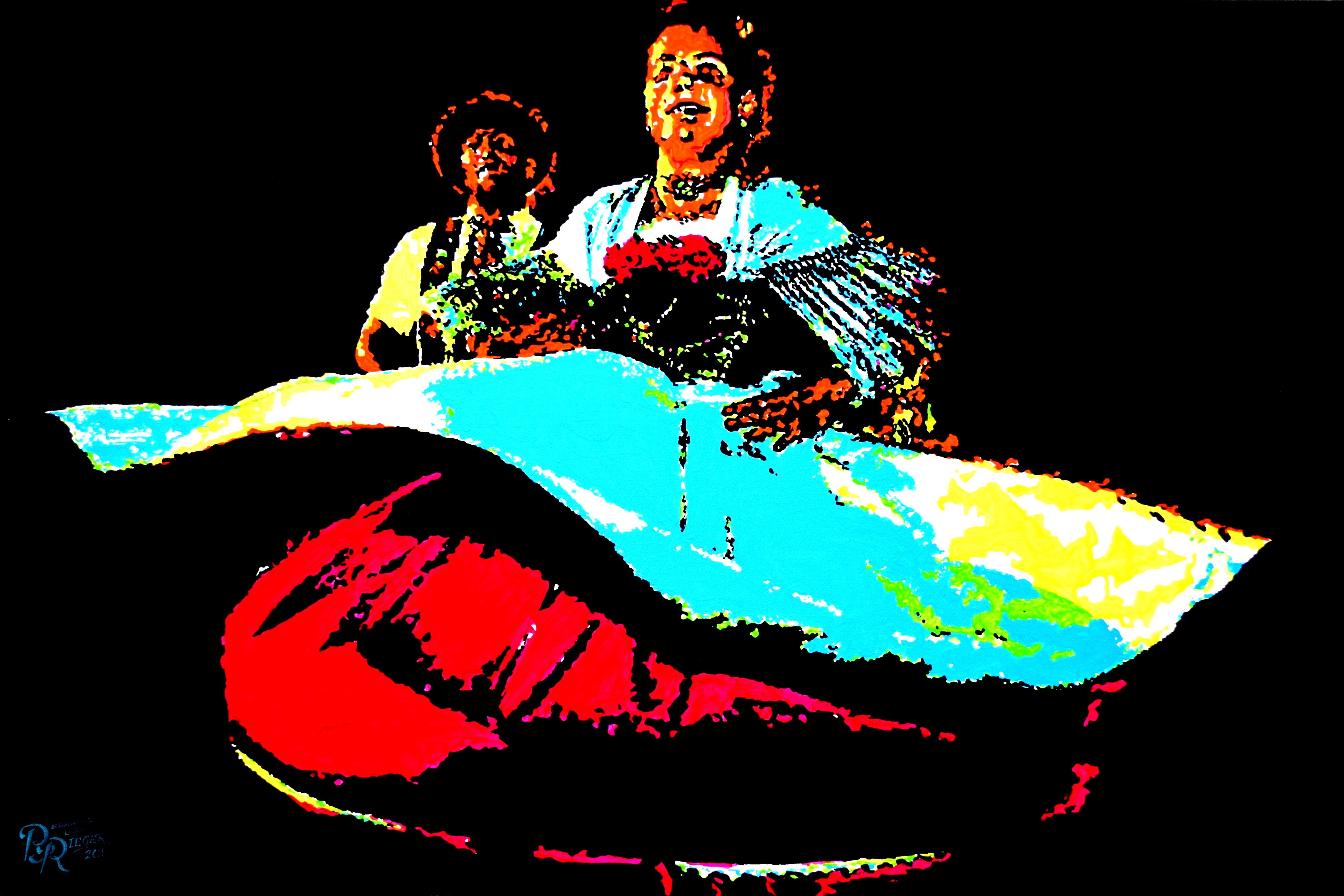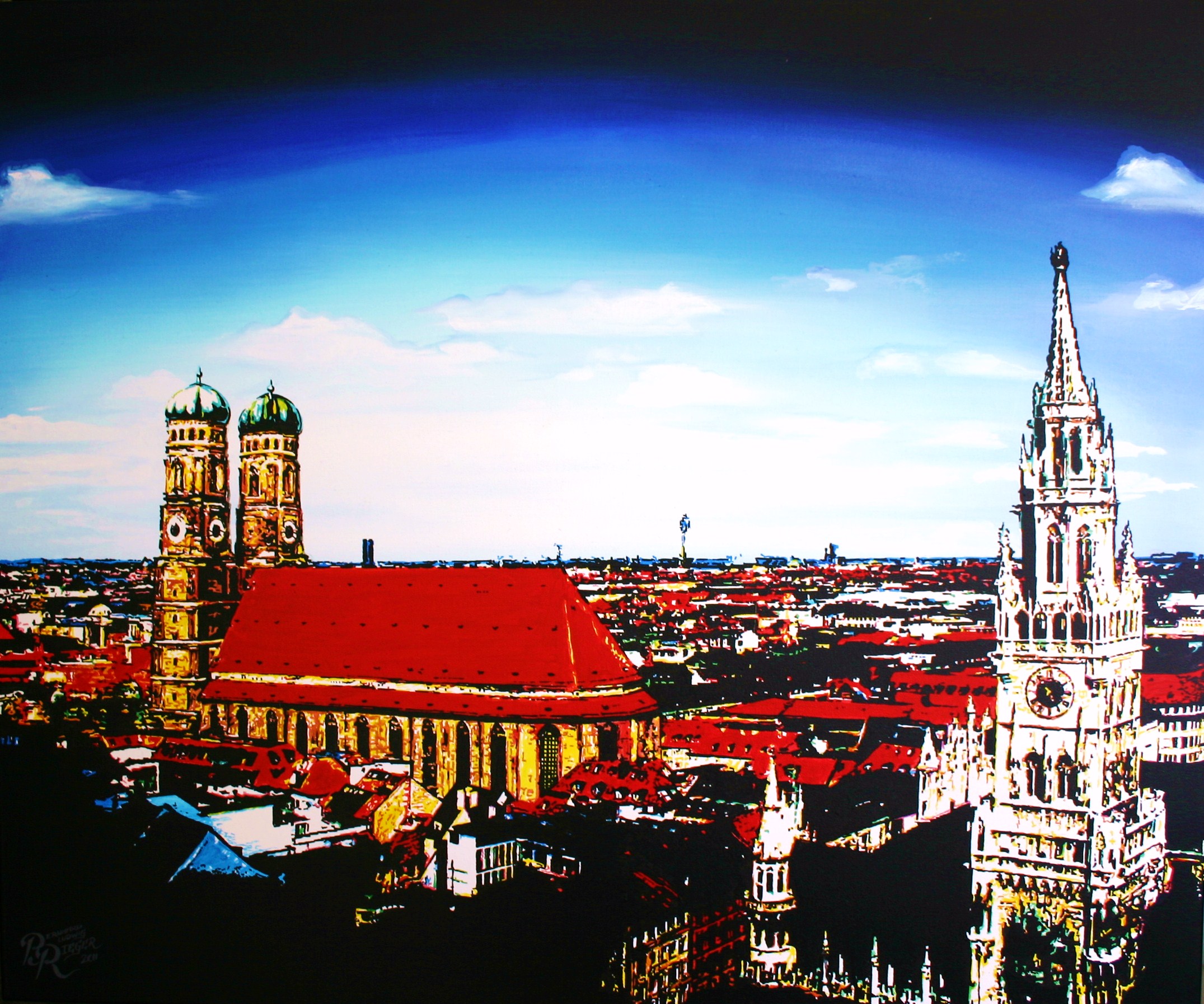 - durch flächige, plakative und illustrative Malweise in Verbindung mit extremer Farbigkeit besticht