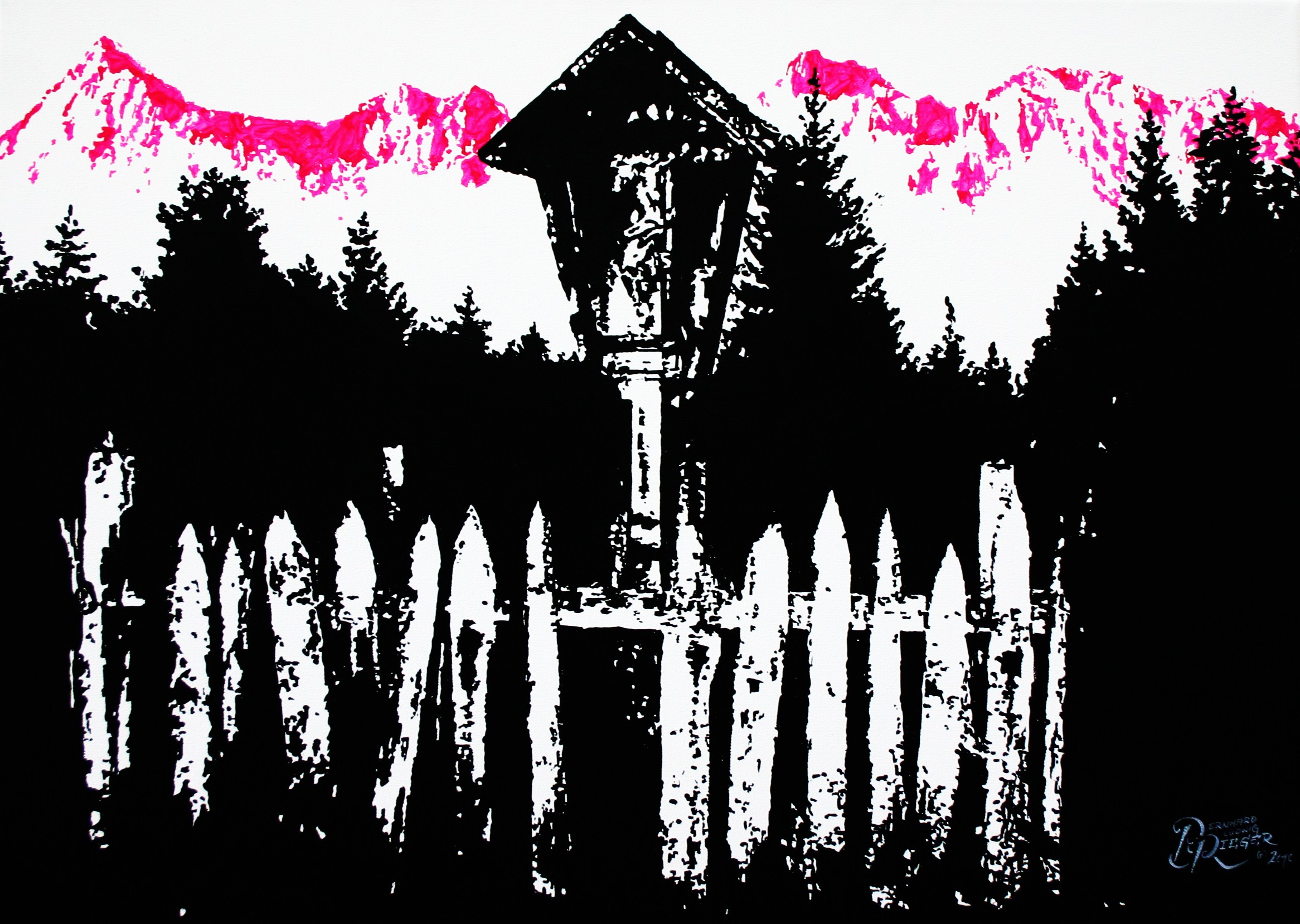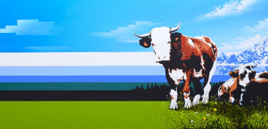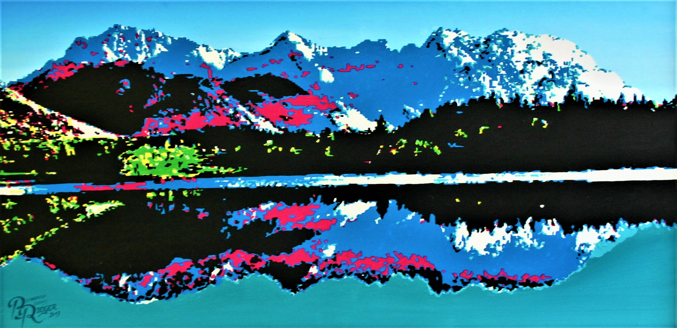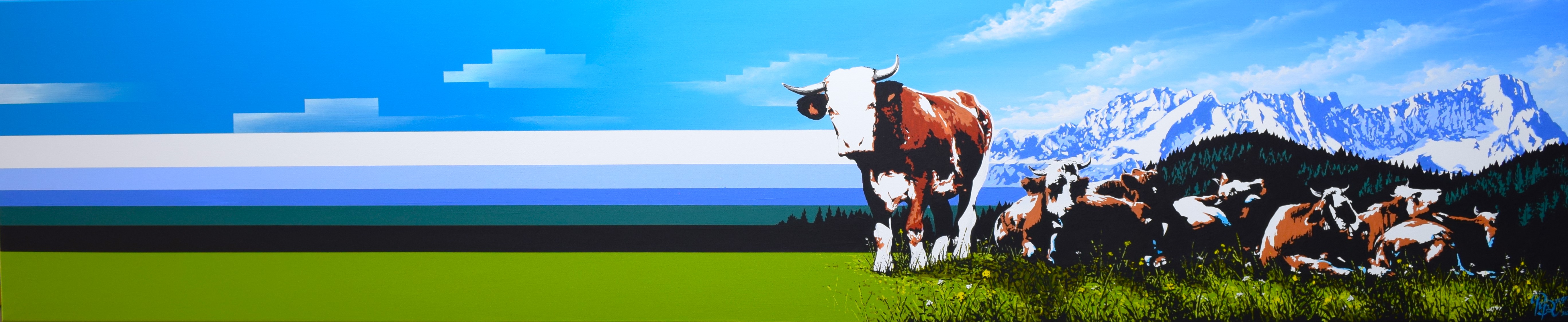 Der realistischen Darstellung eines Berges spreche ich eine besondere Rolle zu, arrangiere aber Szenen der Alm und des Idylls in meiner Heimat auf eine ganz neue Art und Weise, und reduziere Landschaftsformationen oder Bergsilhouetten auf definierte und teils extrem überzeichnete Flächen. Eine übersättigte Farbgebung und das Zusammenspiel von komplexen und komplementären Farbkompositionen zeichnen meine AlpinPopArt aus. Die Wirkung des Lichteinfalles in Verbindung mit den tageszeitlichen Stimmungen spielen dabei ein große Rolle und ermöglichen mir jedem Gemälde eine ganz besondere Energie und polarisierende Wirkung zu verleihen. Meine Gemälde, die größtenteils Auftragsarbeiten sind und in engem Austausch mit den Auftraggebern entstehen, werden auf ästhetische Art und Weise abgestimmt und ausgeführt, und tragen wesentlich zur zeitgenössischen Raumgestaltung bei.