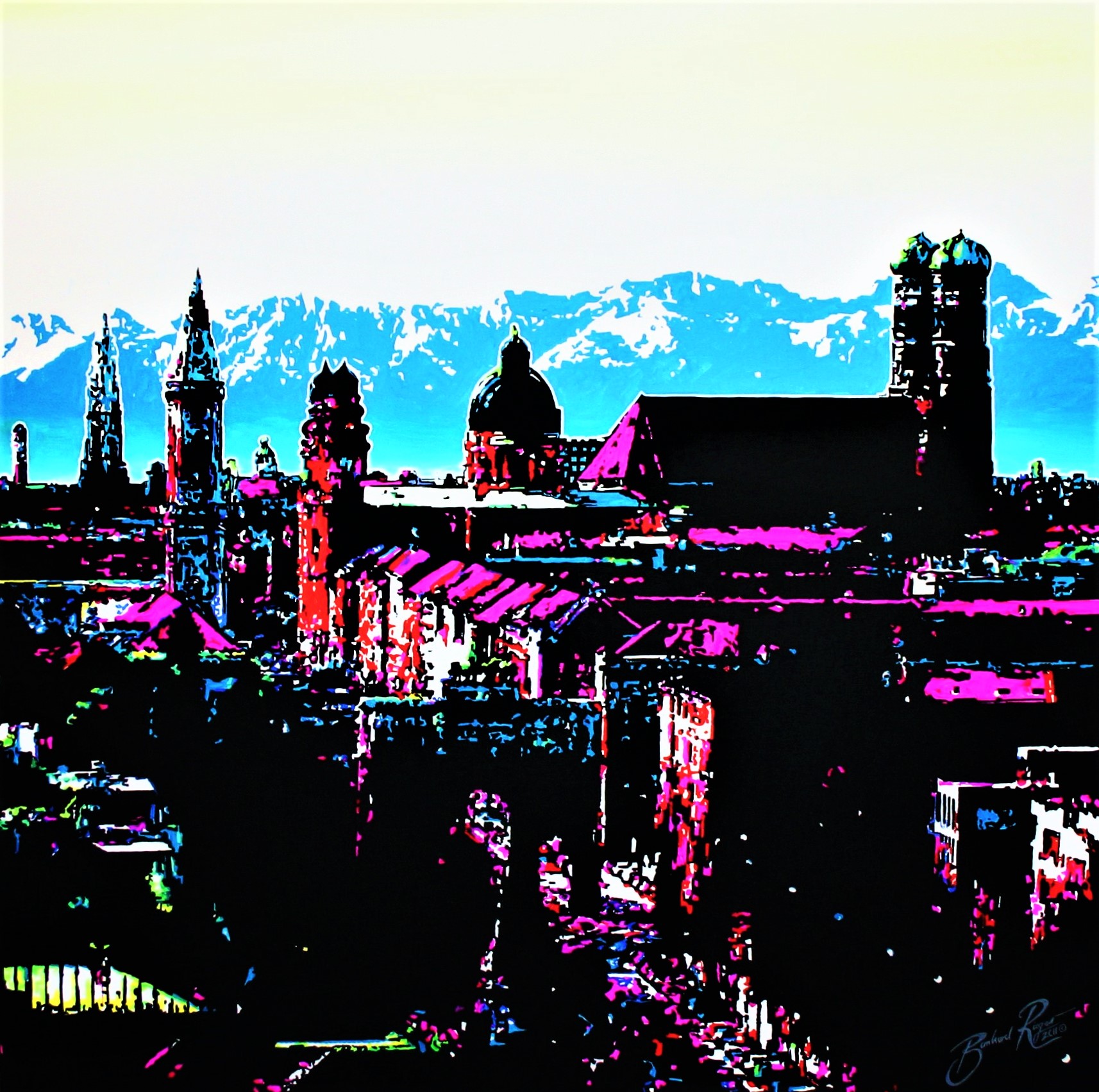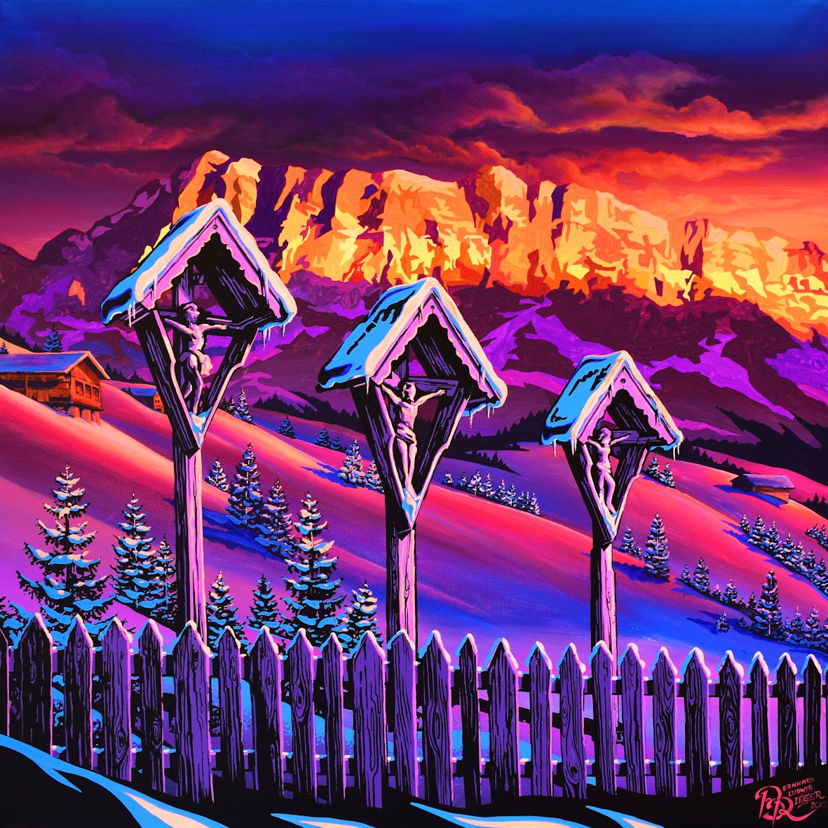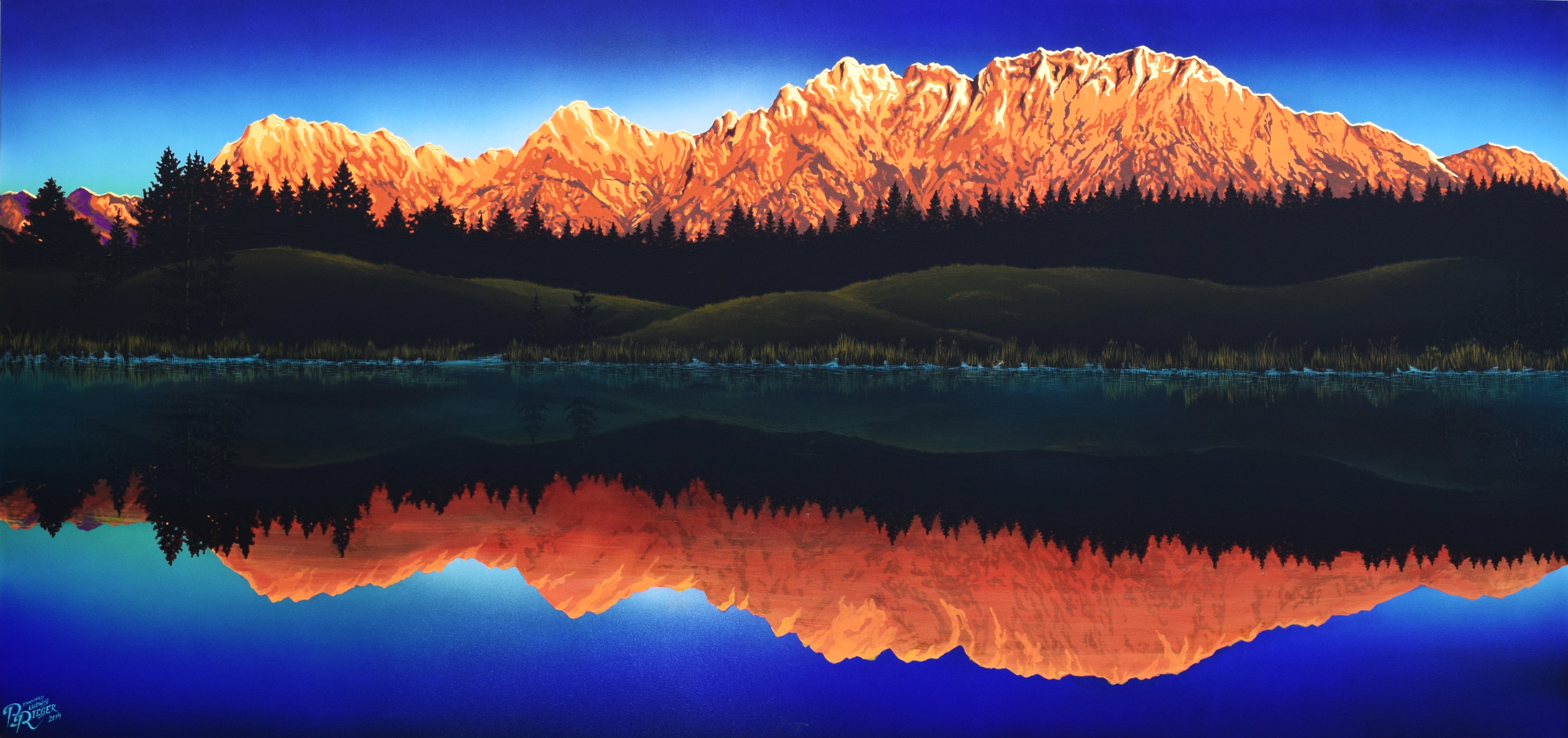 Der realistischen Darstellung eines Berges spreche ich eine besondere Rolle zu, arrangiere aber Szenen der Alm und des Idylls in meiner Heimat auf eine ganz neue Art und Weise, und reduziere Landschaftsformationen oder Bergsilhouetten auf definierte und teils extrem überzeichnete Flächen. Eine übersättigte Farbgebung und das Zusammenspiel von komplexen und komplementären Farbkompositionen zeichnen meine AlpinPopArt aus. Die Wirkung des Lichteinfalles in Verbindung mit den tageszeitlichen Stimmungen spielen dabei ein große Rolle und ermöglichen mir jedem Gemälde eine ganz besondere Energie und polarisierende Wirkung zu verleihen. Meine Gemälde, die größtenteils Auftragsarbeiten sind und in engem Austausch mit den Auftraggebern entstehen, werden auf ästhetische Art und Weise abgestimmt und ausgeführt, und tragen wesentlich zur zeitgenössischen Raumgestaltung bei.