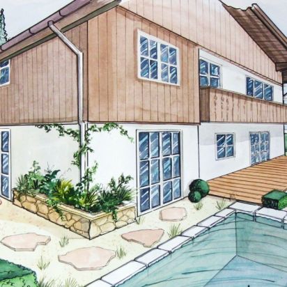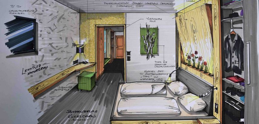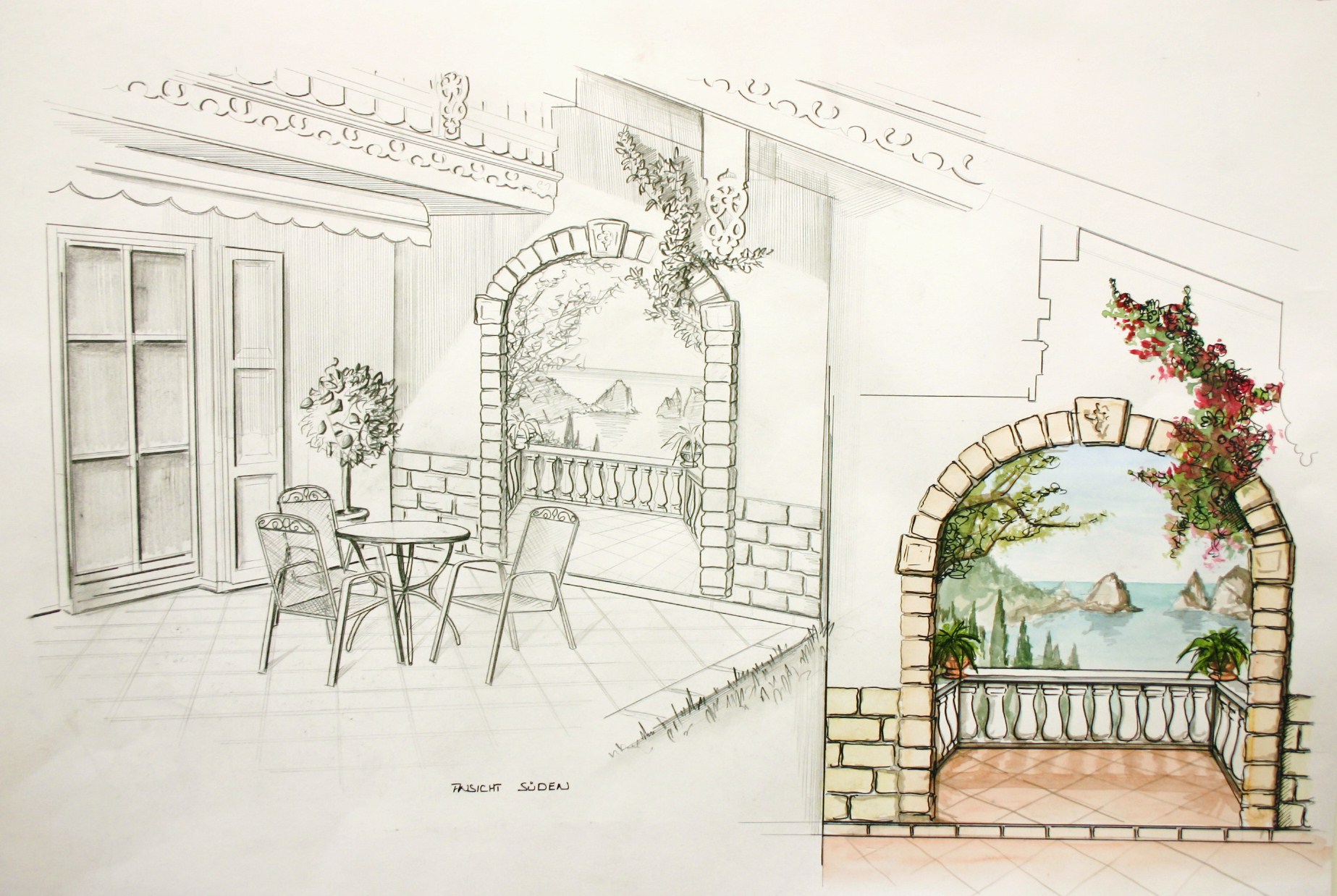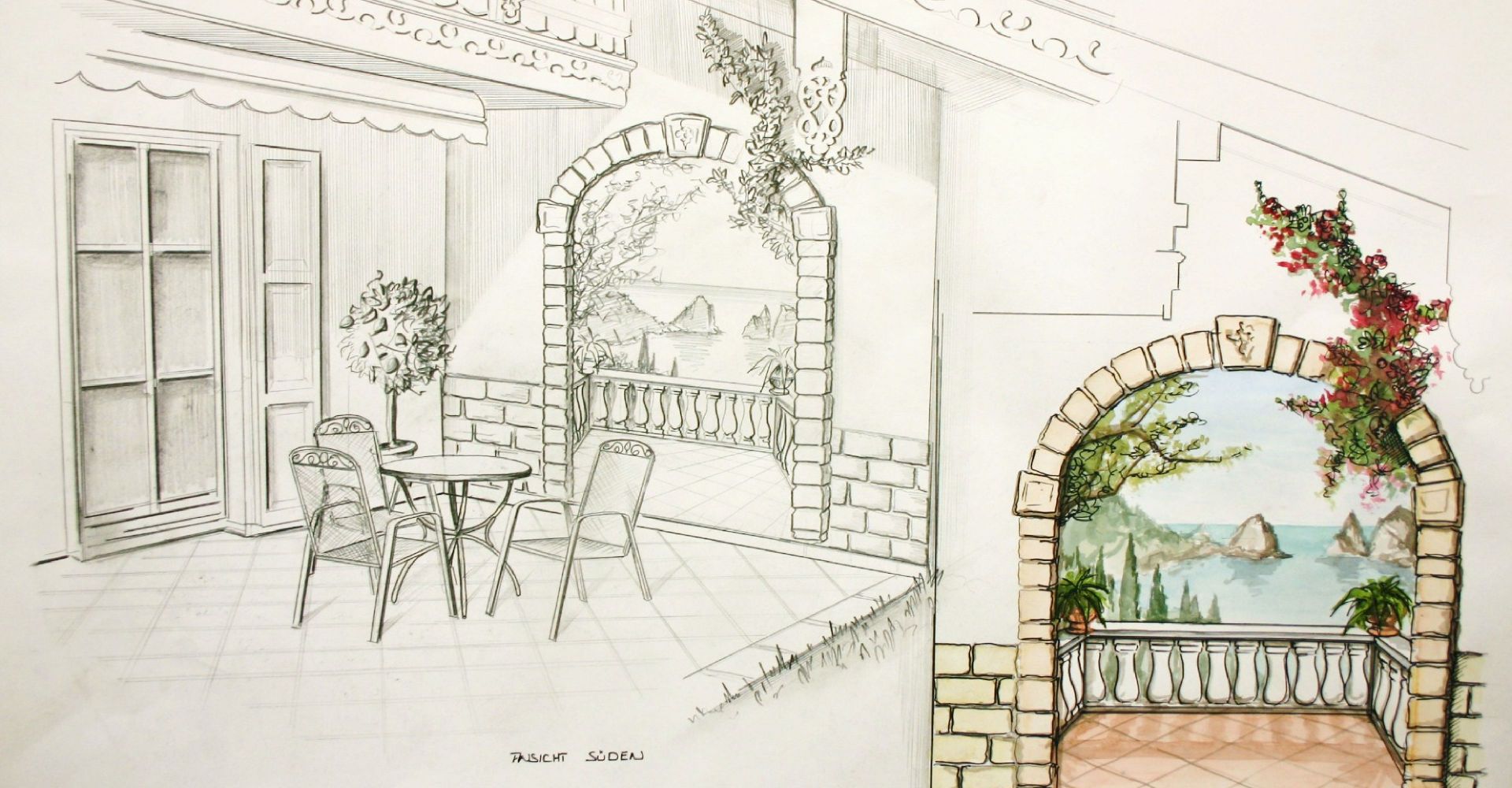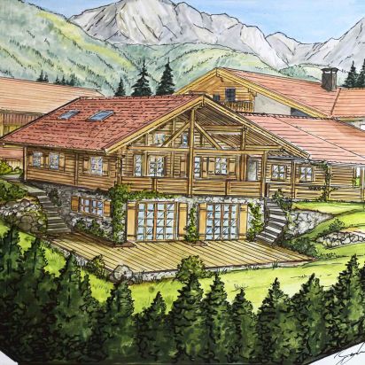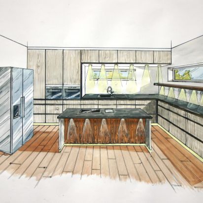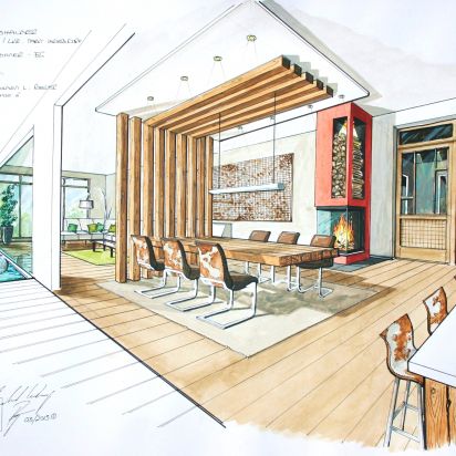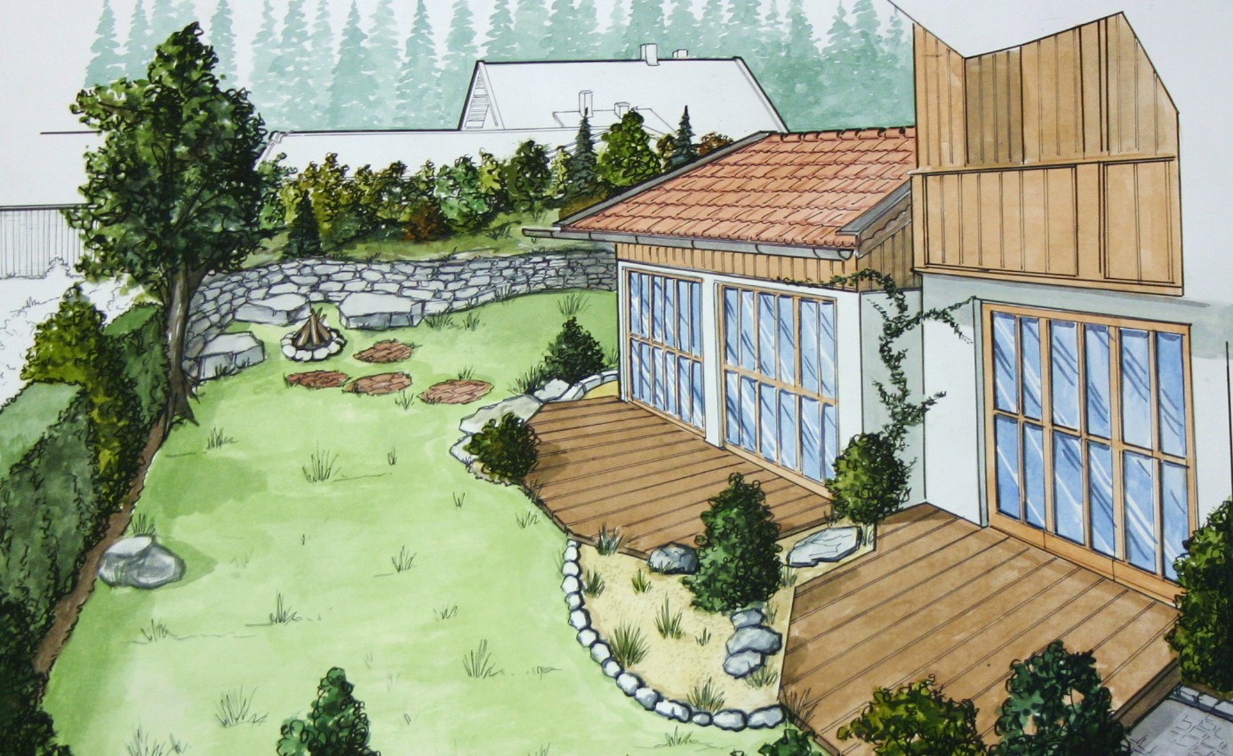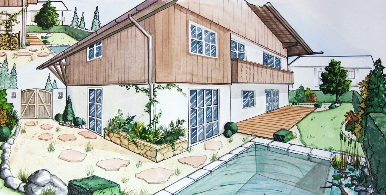 Nicht nur für eigene Projektumsetzungen fertige ich handgezeichnete und digital unterstütze Visualisierungen an, sondern auch für Unternehmen und Kunden, die Wert auf die Präsentation ihrer Projekte durch Handzeichnungen legen. Sowohl mit CAD erstellte Pläne als auch aufwendig colorierte und detaillierte Entwurfszeichnungen mit maßstabsgetreuen Darstellungen der Baumaßnahme werden maßgebliches Element einer schlüssigen Auftragspräsentation. Vor allem in der Raumgestaltung, Innenarchitektur aber auch im Garten- und Landschaftsbau sind Handskizzen beim Kunden gern gesehen.