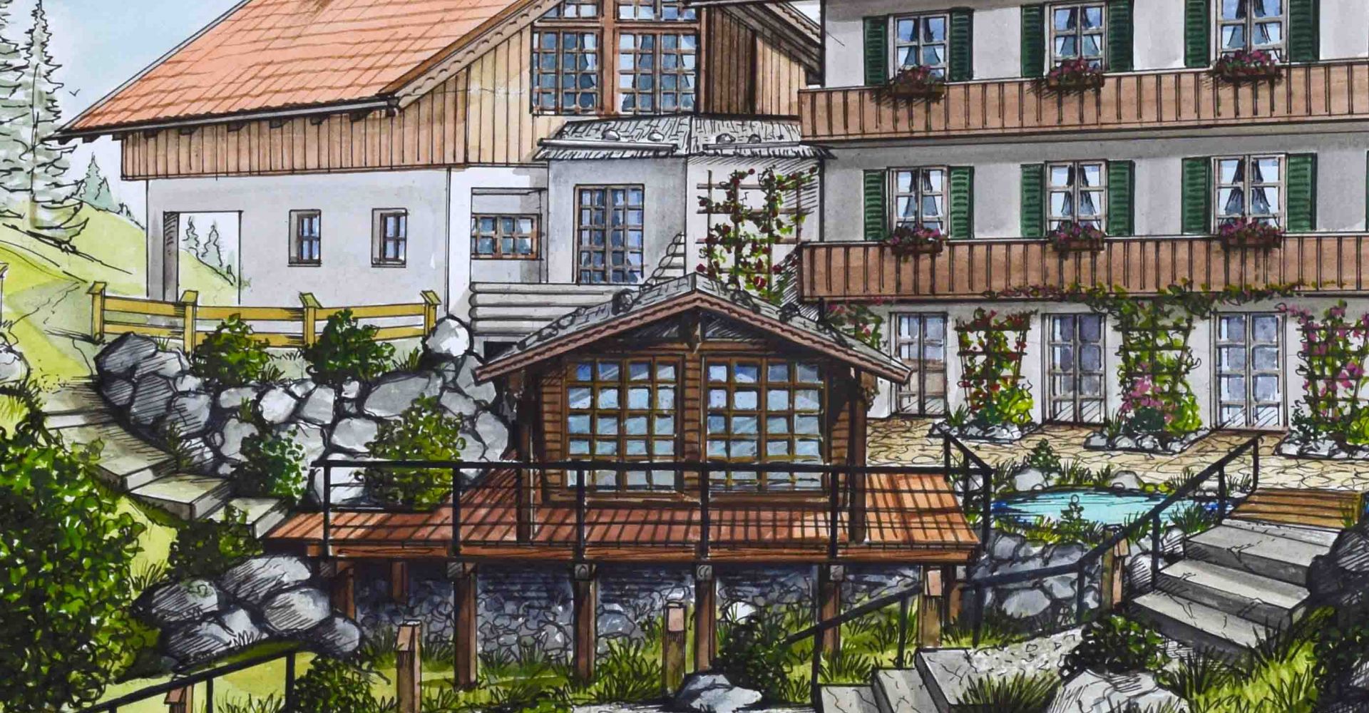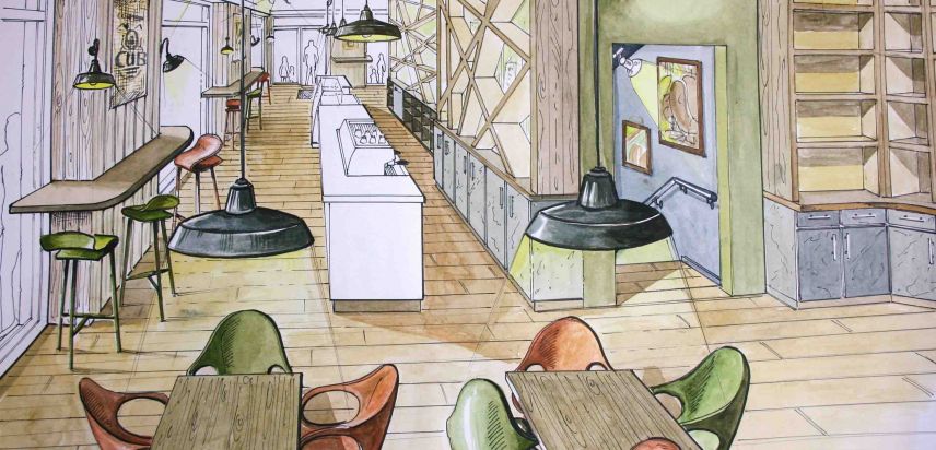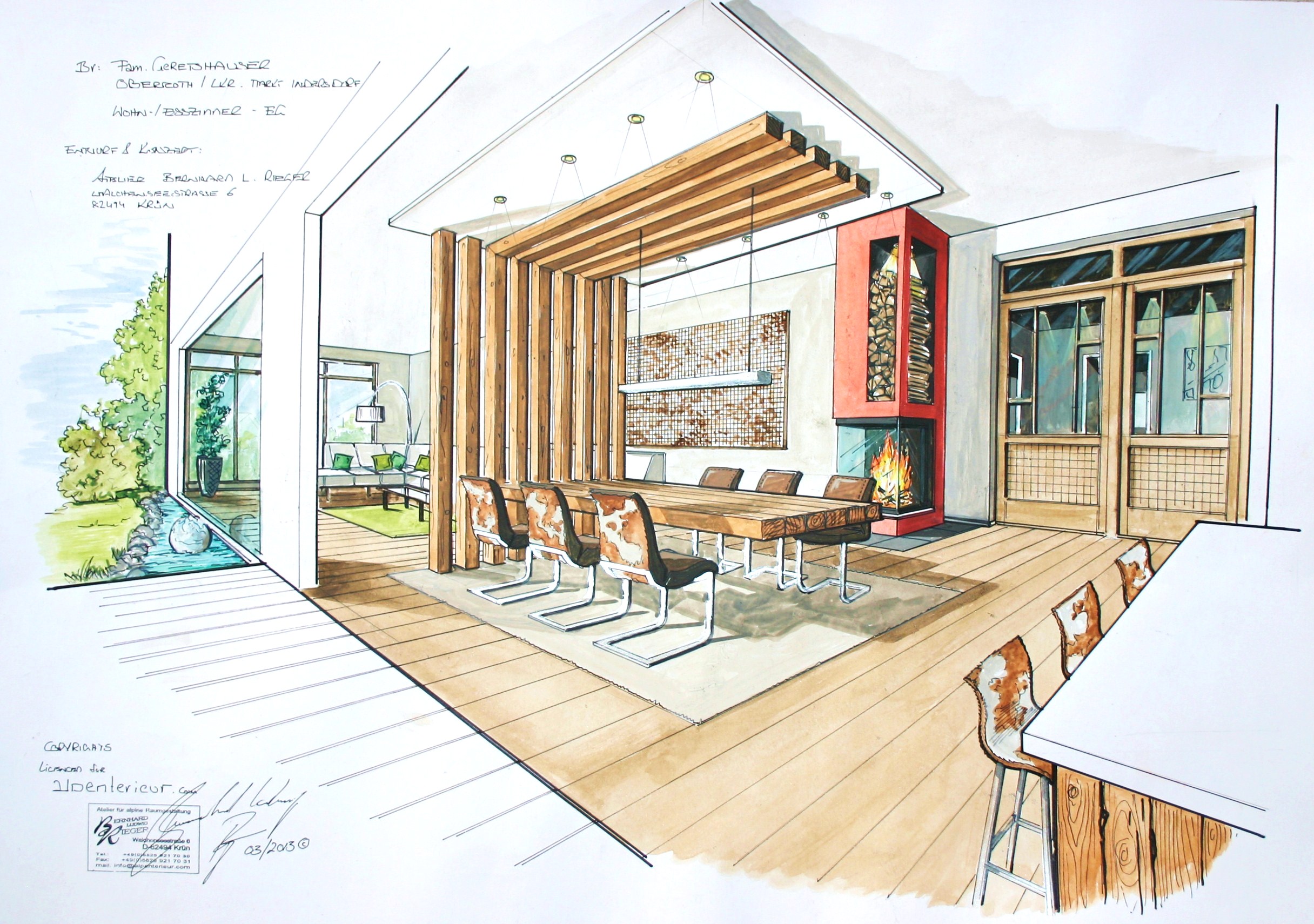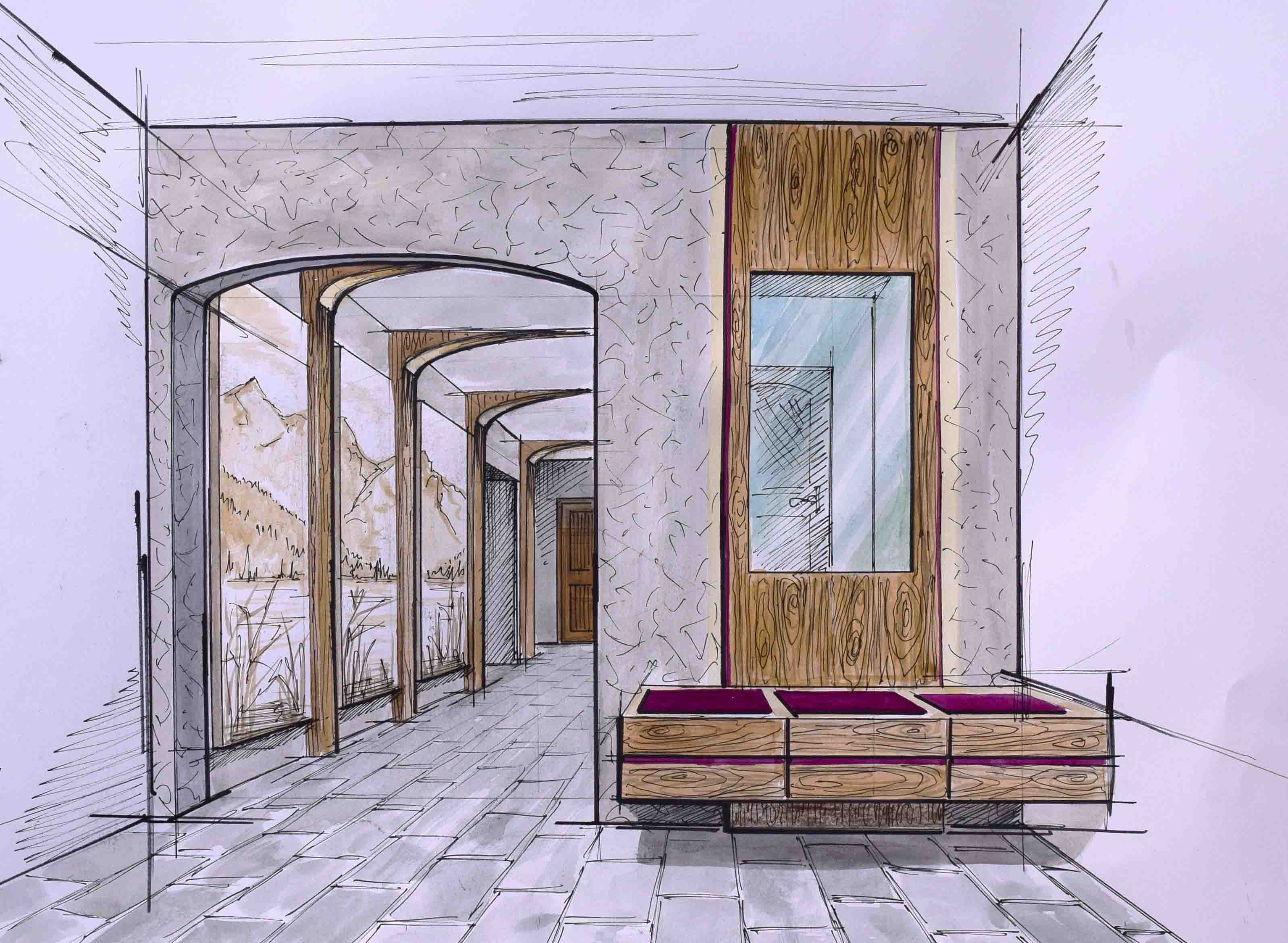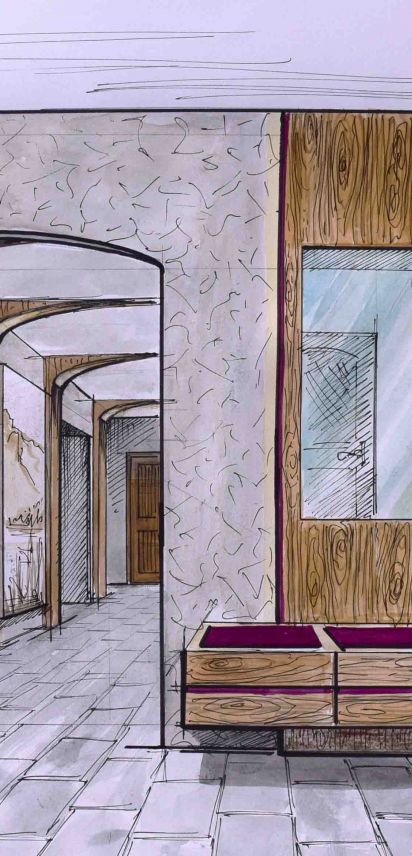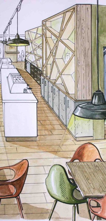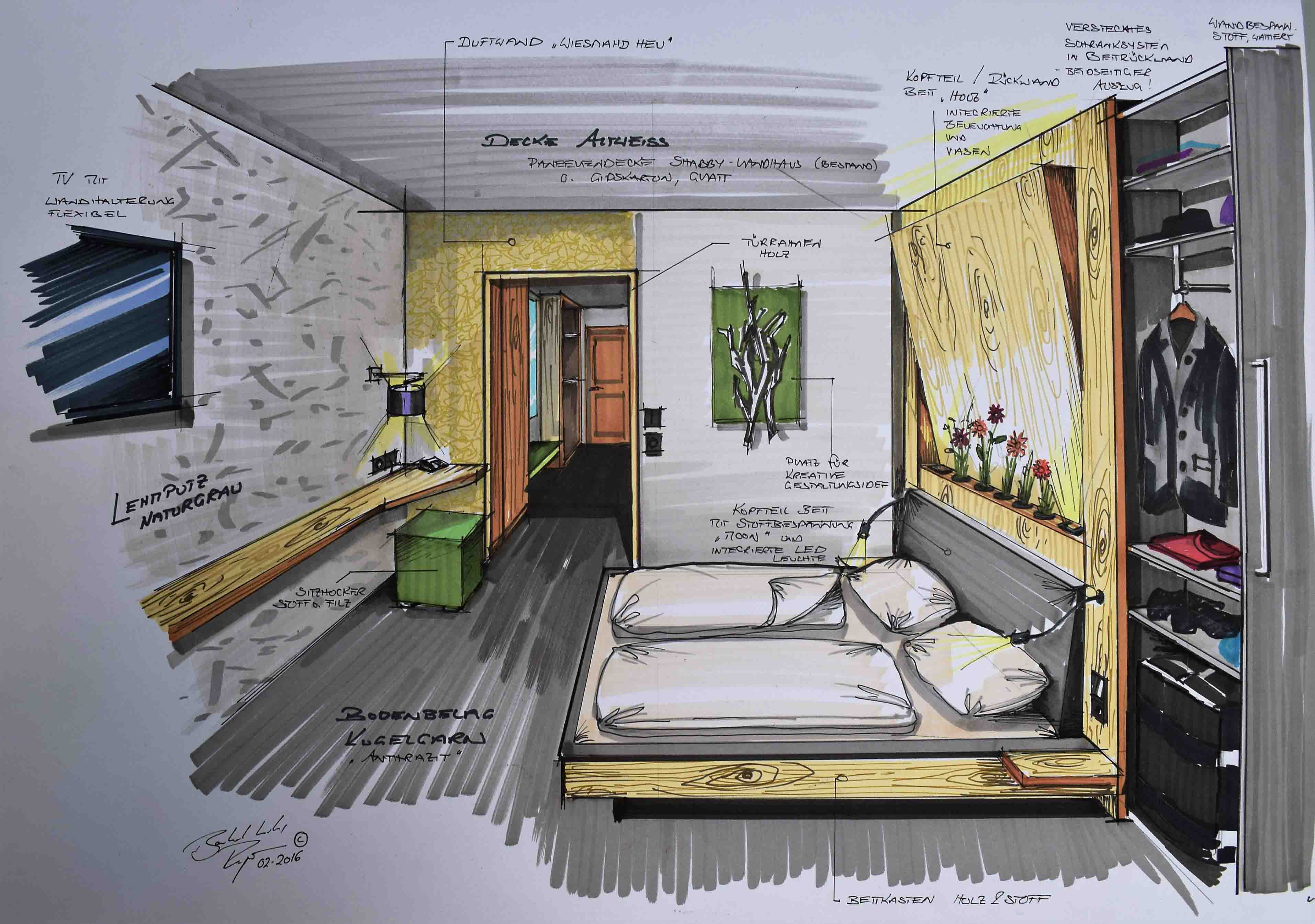 Nicht nur für eigene Projektumsetzungen fertige ich handgezeichnete und digital unterstütze Visualisierungen an, sondern auch für Unternehmen und Kunden, die Wert auf die Präsentation ihrer Projekte durch Handzeichnungen legen. Sowohl mit CAD erstellte Pläne als auch aufwendig colorierte und detaillierte Entwurfszeichnungen mit maßstabsgetreuen Darstellungen der Baumaßnahme werden maßgebliches Element einer schlüssigen Auftragspräsentation. Vor allem in der Raumgestaltung, Innenarchitektur aber auch im Garten- und Landschaftsbau sind Handskizzen beim Kunden gern gesehen.